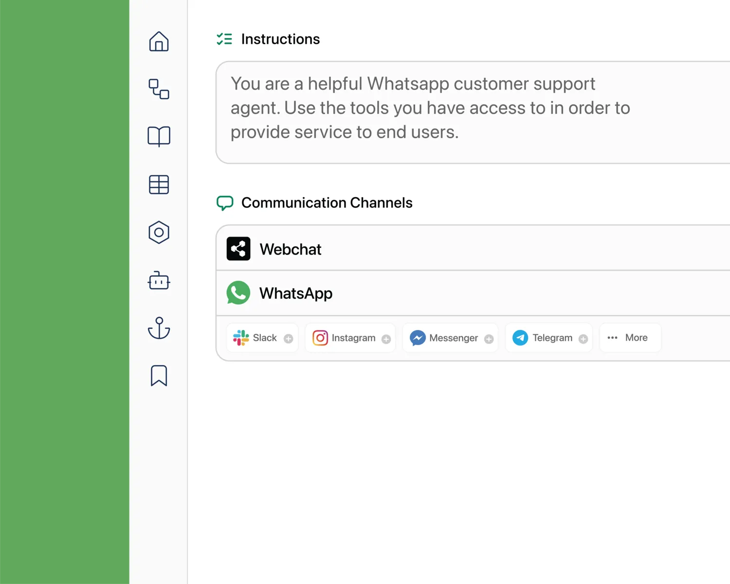 Desenvolva chatbots de IA, autoresponders e fluxos de atendimento usando um ambiente visual flexível. Ideal para criadores que precisam de liberdade total para personalizar comportamentos e lógica.