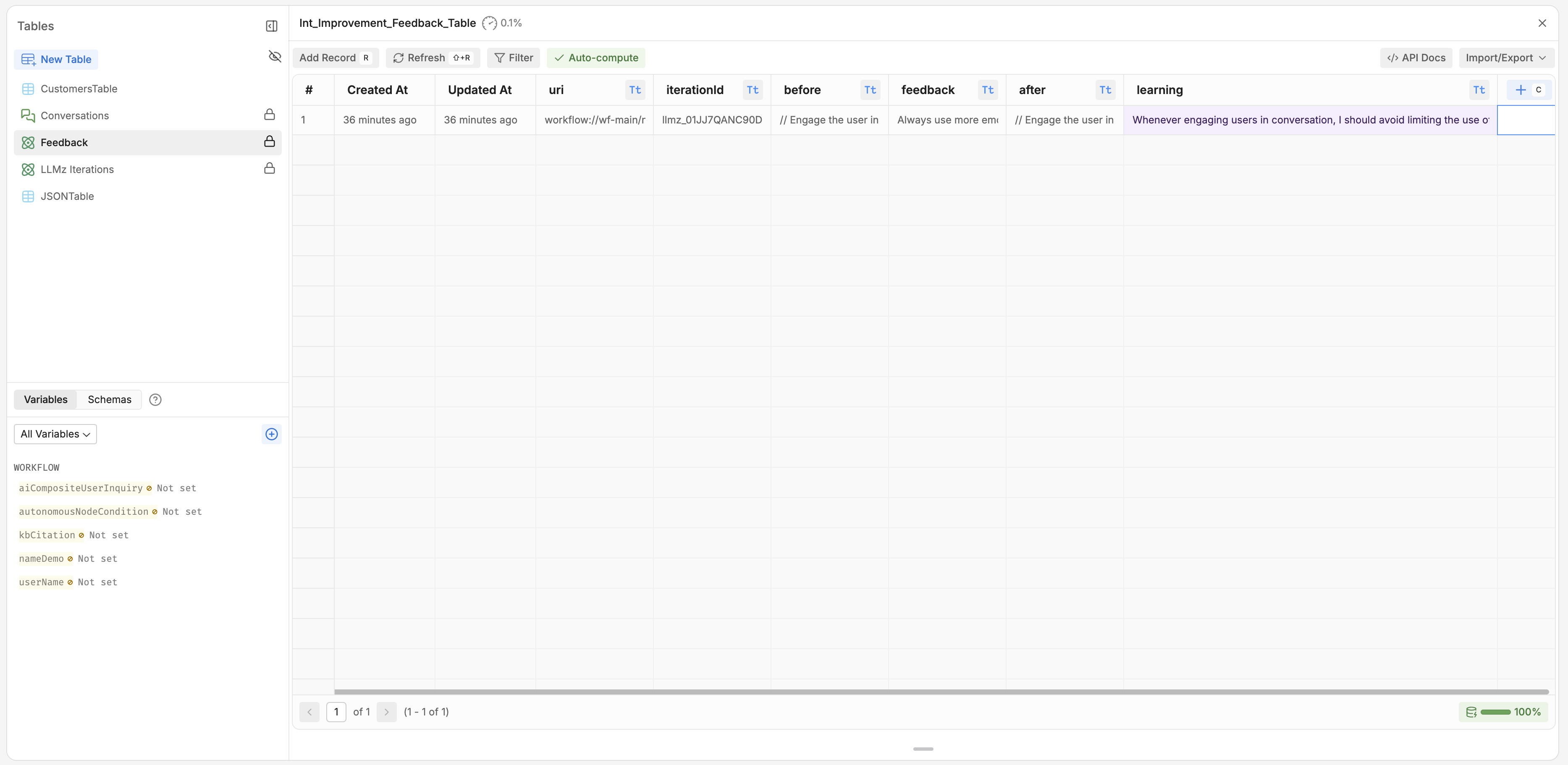 After installing the integration, all of the iterations produced by LLMz via an Autonomous Node will be stored in the automatically-created “LLMz iterations” Table. Iterations are produced at the message level, meaning a single conversation will typically have multiple iterations.